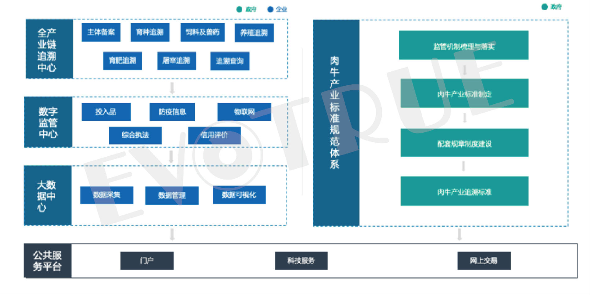 “3”是打造3個(gè)中心。一是肉牛全產(chǎn)業(yè)鏈追溯中心,經(jīng)過(guò)近半年的調(diào)研,天演維真在全面掌握科左中旗肉牛全產(chǎn)業(yè)鏈流程后,構(gòu)建肉牛全產(chǎn)業(yè)鏈追溯中心,對(duì)肉牛養(yǎng)殖、防疫、育肥、屠宰等全過(guò)程進(jìn)行追溯管理。二是肉牛質(zhì)量安全數(shù)字監(jiān)管中心,構(gòu)建肉牛質(zhì)量安全數(shù)字監(jiān)管中心,依托互聯(lián)網(wǎng)、物聯(lián)網(wǎng)等現(xiàn)代信息技術(shù)的應(yīng)用,將肉牛生產(chǎn)全過(guò)程的信息轉(zhuǎn)化為數(shù)據(jù),為監(jiān)管部門開展工作和做出決策提供有力的證據(jù),保證執(zhí)法監(jiān)管部門開展工作的公正客觀性,同時(shí)向公眾傳遞消費(fèi)信任度。三是肉牛產(chǎn)業(yè)大數(shù)據(jù)中心,通過(guò)大數(shù)據(jù)“一張圖”掌握科左中旗肉牛全產(chǎn)業(yè)鏈數(shù)據(jù),并綜合采用數(shù)據(jù)倉(cāng)庫(kù)、數(shù)據(jù)挖掘、元數(shù)據(jù)管理、決策分析模型等技術(shù),對(duì)主要指標(biāo)進(jìn)行實(shí)時(shí)量化分析、預(yù)判預(yù)警和直觀呈現(xiàn),為智慧監(jiān)管提供數(shù)據(jù)支撐。