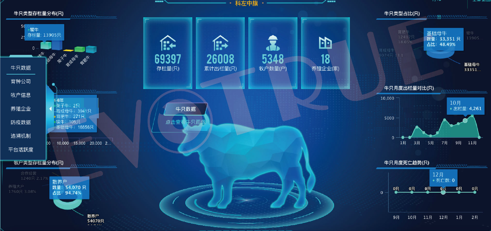 此外,肉牛大數(shù)據(jù)能夠?qū)Ξa(chǎn)量和價(jià)格進(jìn)行預(yù)測(cè),服務(wù)肉牛的生產(chǎn)經(jīng)營(yíng)主體,幫助牧戶標(biāo)準(zhǔn)化養(yǎng)殖、脫貧、致富。同時(shí)還能很好地服務(wù)監(jiān)管部門,通過(guò)大數(shù)據(jù)的可視化“指揮艙”,對(duì)肉牛的生產(chǎn)、經(jīng)營(yíng)、管理、服務(wù)全產(chǎn)業(yè)鏈進(jìn)行有效的監(jiān)管和決策,通過(guò)大數(shù)據(jù)平臺(tái)掌握全局,真正做到科學(xué)管理、智能決策。