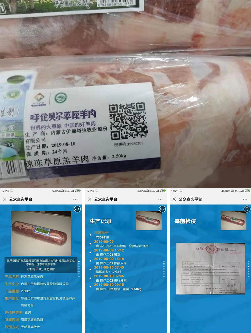 呼倫貝爾草原羊肉成品上印有專屬二維碼,消費(fèi)者可以掃描查詢草原羊肉養(yǎng)殖、防疫、屠宰加工、分割、包裝等全部信息,實(shí)現(xiàn)全程可追溯,提升消費(fèi)者的信任度。